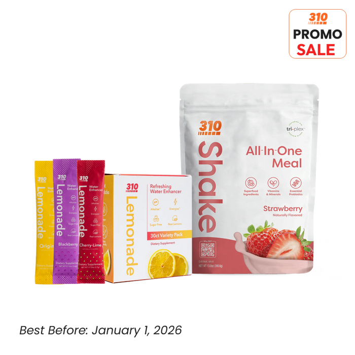 Sweet strawberry shake plus a 30-count lemonade variety pack—packed with protein, electrolytes, and flavor to keep you nourished, hydrated, and feeling your best.