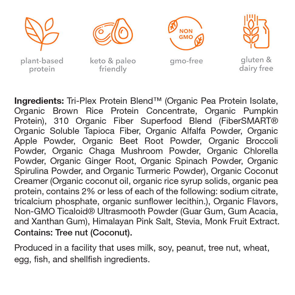 Ingredients: 310 Tri-Plex Blend™ (Organic Pea Protein Isolate, Organic Brown Rice Protein Concentrate, Organic Pumkin Protein), 310 Organic Fiber Superfood Blend (FiberSMART® Organic Soluble Tapioca Fiber, Organic Alfalfa Powder, Organic Apple Powder, Organic Beet Root Powder, Organic Broccoli Powder, Organic Chaga Mushroom Powder, Organic Chlorella Powder, Organic Ginger Root, Organic Spinach Powder, Organic Spirulina Powder, and Organic Turmeric Powder), Organic Coconut Creamer (Organic coconut oil, organic rice syrup solids, organic pea protein, contains 2% or less of each of the following: sodium citrate, tricalcium phosphate, organic sunflower lecithin.), Organic Flavors, Non-GMO Ticaloid® Ultrasmooth Powder (Guar Gum, Gum Acacia, and Xantham Gum), Himalayan Pink Salt, Stevia, Monk Fruit Extract. Contains: Tree nut (Coconut).