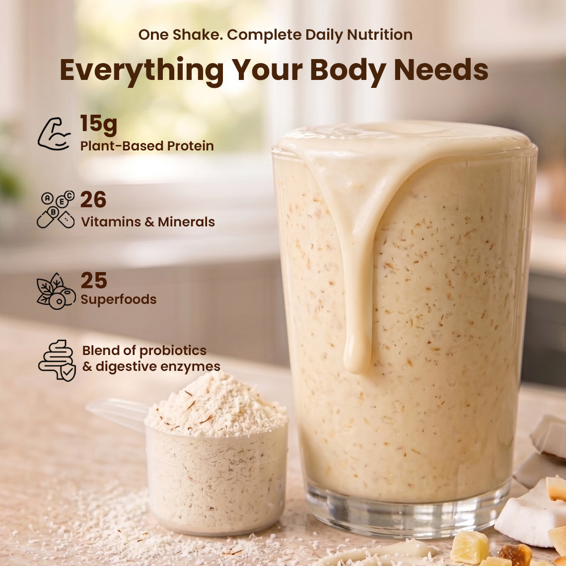 15g plant protein, 50+ vitamins and superfoods, 0g added sugar — in 30 seconds.